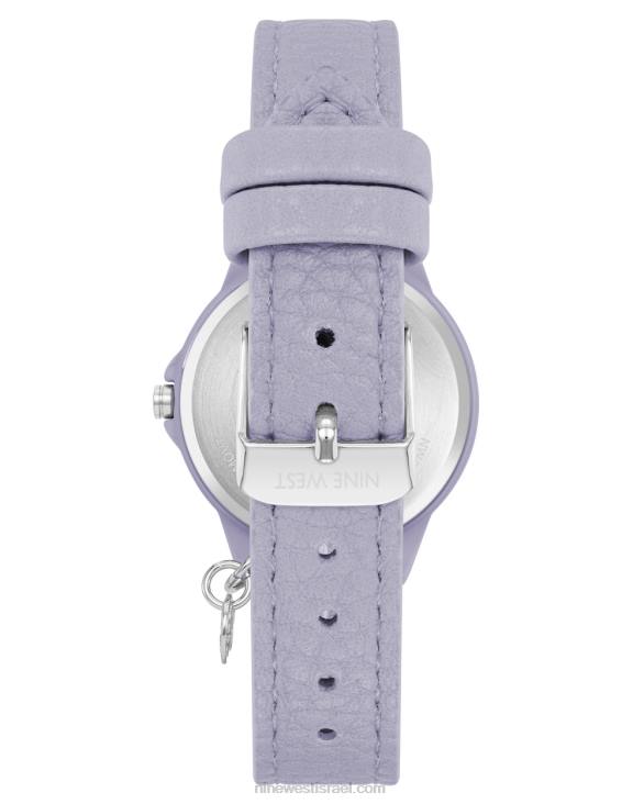 חוגה במרקם לבנדר עם מחוגים וטושים בגוון כסף מלא לבן; רצועת עור מלאכותית שחורה חיצונית